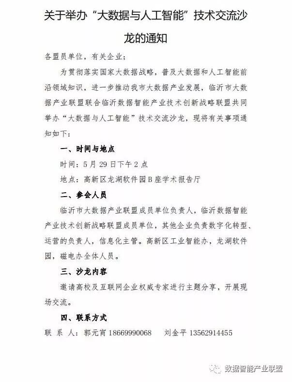为贯彻落实国家大数据战略,普及大数据和人工智能前沿领域知识,进一步推动我市大数据产业发展,临沂市大数据产业联盟联合临沂数据智能产业技术创新战略联盟共同举办“大数据与人工智能”技术交流沙龙于2019年5月29日下午2点在高新区龙湖软件园 B 座学术报告厅举行。